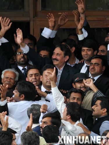 3月16日,在巴基斯坦伊斯蘭堡,喬杜里(中、留胡子未系領(lǐng)帶者)和律師們參加慶;顒(dòng)。巴基斯坦總理吉拉尼16日發(fā)表電視講話,宣布恢復(fù)喬杜里巴基斯坦最高法院首席大法官的職務(wù)。喬杜里在2007年11月巴前總統(tǒng)穆沙拉夫?qū)嵭芯o急狀態(tài)時(shí)被解職。 新華社記者饒博攝