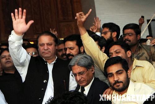 3月16日,巴基斯坦前總理、穆斯林聯(lián)盟(謝里夫派)領(lǐng)導(dǎo)人謝里夫(左)在東部旁遮普省的古杰蘭瓦拉市參加集會(huì)活動(dòng)。謝里夫在當(dāng)日的集會(huì)上說(shuō),鑒于政府已同意恢復(fù)被解職的最高法院首席大法官喬杜里的職務(wù),他宣布停止其領(lǐng)導(dǎo)的游行抗議活動(dòng)。 新華社/法新