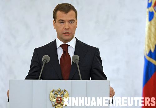 2008年11月5日,俄羅斯總統(tǒng)梅德韋杰夫在首都莫斯科的克里姆林宮向議會兩院發(fā)表國情咨文時提議,將俄總統(tǒng)任期從目前的4年延長至6年,將國家杜馬(議會下院)議員任期從4年延長至5年。新華社/路透