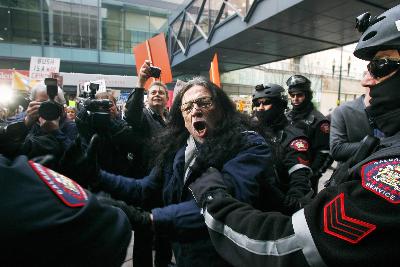據報道,被警察逮捕的一名男子表示,他試圖進入演講會場“逮捕布什”。他稱“布什犯下謀殺罪行”,被捕時他還不斷高喊“逮捕布什”。眾多示威群眾舉著“對美國違反人道的罪行說不”,“以戰爭罪犯名義起訴布什”,“加拿大不是布什國”等標語,在布什演講場地大樓外示威。
