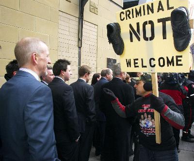 就在布什在會場內談笑風生的同時,大約200名民眾則在會場外振臂高呼,抗議布什離開白宮后的首次公開演講。示威者高呼“戰爭罪犯”并向布什的海報扔鞋子,以表達對他的憤怒。至少有4名示威者因為涉嫌制造沖突而被警方帶走。