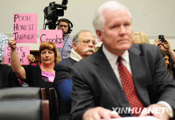 3月18日,美國保險業巨頭美國國際集團(AIG)總裁兼首席執行官愛德華·利迪(前)在位于華盛頓的美國國會山出席國會眾議院金融委員會舉行的聽證會,抗議者在其身后高舉標語。新華社記者張巖攝