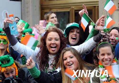 3月17日,在美國紐約曼哈頓,觀眾興奮地和圣帕特里克節游行隊伍打招呼。當日,紐約舉行盛大游行,慶祝圣帕特里克節。圣帕特里克節是愛爾蘭人紀念愛爾蘭守護神圣帕特里克的節日,至今已有1500多年歷史,這一節慶傳統被愛爾蘭移民帶入美國。新華社記者 申宏 攝