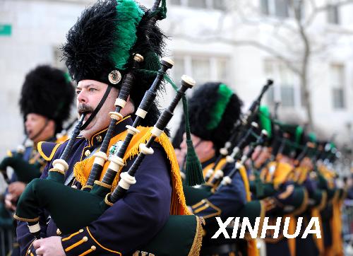 3月17日,在美國紐約曼哈頓,軍樂手在圣帕特里克節游行中表演。當日,紐約舉行盛大游行活動慶祝圣帕特里克節。圣帕特里克節是愛爾蘭人紀念愛爾蘭守護神圣帕特里克的節日,至今已有1500多年歷史,這一節慶傳統被愛爾蘭移民帶入美國。 新華社記者 申宏攝