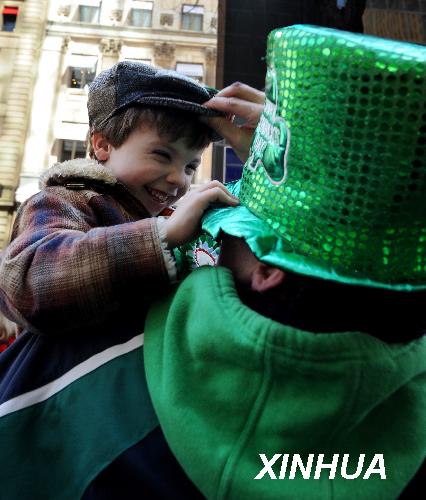 3月17日,在美國紐約曼哈頓,一名男孩為父親戴上喜慶的綠色帽子。當日,紐約舉行盛大游行活動慶祝圣帕特里克節。圣帕特里克節是愛爾蘭人紀念愛爾蘭守護神圣帕特里克的節日,至今已有1500多年歷史,這一節慶傳統被愛爾蘭移民帶入美國。新華社記者 谷欣容攝