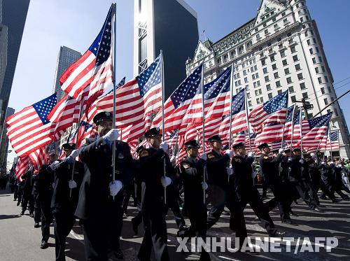 3月17日,在美國紐約,紐約消防員參加圣帕特里克節游行。當日,紐約舉行盛大游行活動慶祝圣帕特里克節。圣帕特里克節是愛爾蘭人紀念愛爾蘭守護神圣帕特里克的節日,至今已有1500多年歷史,這一節慶傳統被愛爾蘭移民帶入美國。新華社/法新