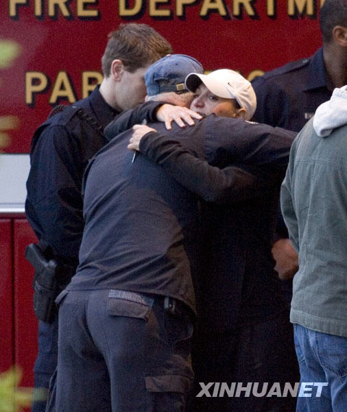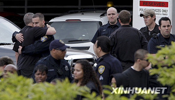 3月21日,在美國加利福尼亞州的奧克蘭市,兩名警察在醫(yī)院門口等候受傷同事的消息時(shí)安慰對方。