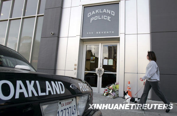 3月21日,在美國加利福尼亞州的奧克蘭市,一名婦女從警察局門前經(jīng)過,警察局門口擺放著悼念殉職警察的鮮花。新華社/路透