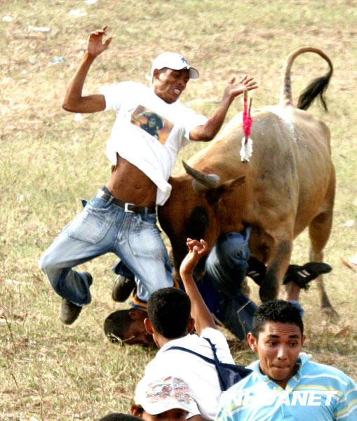 3月21日,在哥倫比亞北部小鎮(zhèn)阿爾霍納,一名斗牛愛好者被公牛頂起。新華社發(fā)(胡安·佩雷斯攝)