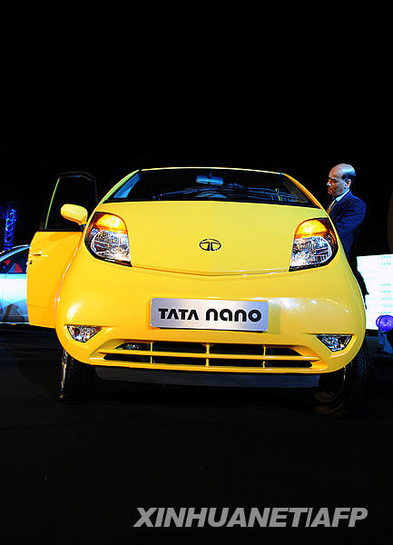3月23日世界上最便宜的汽車——印度塔塔汽車公司生產的“塔塔Nano”在印度孟買的汽車展上正式亮相, “塔塔Nano”售價僅為2000美元,號稱全球價格最低的汽車。生產商塔塔公司主席拉坦·塔塔為NANO揭幕。中新網圖