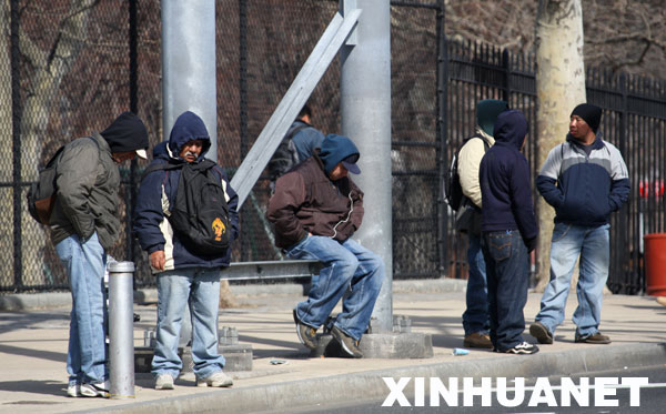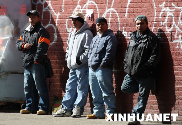3月25日,幾名失業者在美國紐約皇后區街頭等待雇主的雇傭。新華社記者劉欣攝