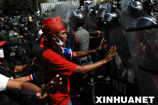 3月26日,一名泰國反獨裁民主聯盟(反獨聯)的支持者在曼谷總理府外與警察對峙。當日,反獨聯的支持者在曼谷舉行大規模反政府集會并包圍了總理府。新華社發(塔納攝)