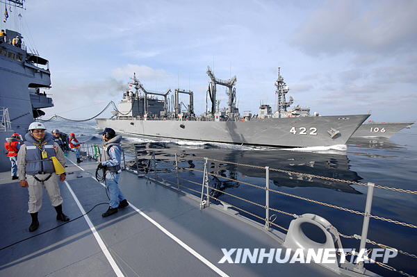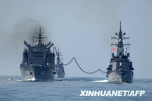 這張3月28日在亞丁灣拍攝的照片顯示,日本海上自衛(wèi)隊的“十和田”補給艦(右,422號)在為“漣”號驅逐艦(左)加油。