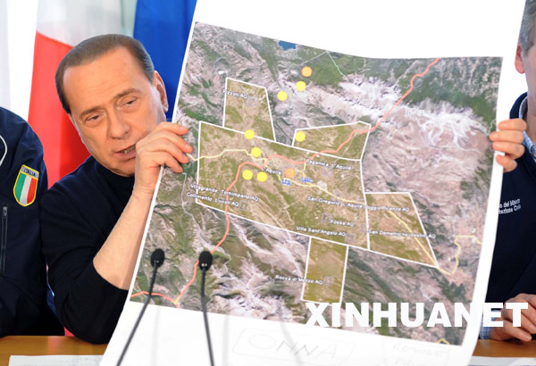 4月8日,在意大利中部地震災(zāi)區(qū)拉奎拉市,意大利總理貝盧斯科尼在新聞發(fā)布會(huì)上介紹災(zāi)情。貝盧斯科尼當(dāng)天表示,地震造成的死亡人數(shù)已經(jīng)達(dá)到260人。新華社記者武巍攝