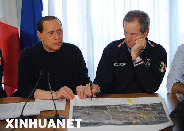 4月8日,在意大利中部地震災(zāi)區(qū)拉奎拉市,意大利總理貝盧斯科尼(左)和意大利民防部門負(fù)責(zé)人貝爾托羅索出席舉行新聞發(fā)布會(huì)。新華社記者武巍攝