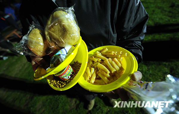 4月7日,在意大利中部地震災(zāi)區(qū)拉奎拉市的安置點(diǎn),一名受災(zāi)居民領(lǐng)到免費(fèi)的晚餐。新華社記者武巍攝