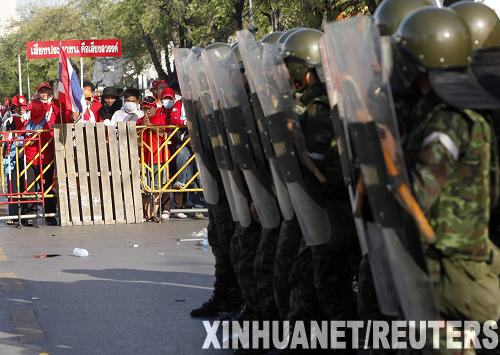 4月12日,在泰國首都曼谷,士兵在反政府示威者聚集處附近警戒。據泰國媒體報道,泰軍方12日下午開始在位于首都曼谷的集拉達王宮、國會、外交部等地部署士兵,以確保這些場所安全。當天下午,泰國總理阿披實宣布在首都曼谷和中部5個府部分地區實施緊急狀態法。新華社/路透