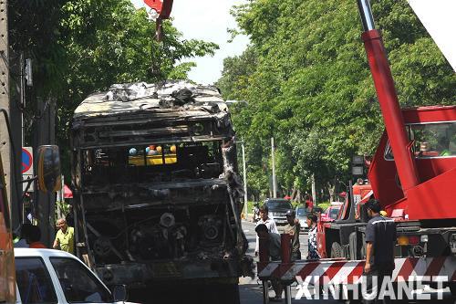 4月14日,在泰國曼谷總理府附近,工人用起重機吊走在示威活動中被燒毀的汽車。當天下午,泰國外交部發表公報說,首都曼谷的局勢已經逐步恢復正常。反獨裁民主聯盟(反獨聯)領導人已經向政府方面自首,并要求示威者結束抗議活動。新華社記者張鳳國攝