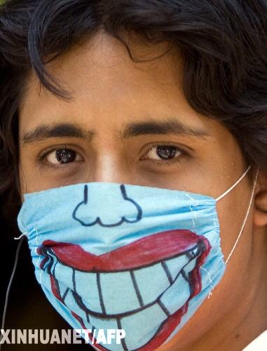 4月28日,在墨西哥首都墨西哥城,一名男子帶著繪制著笑容圖案的口罩。截至29日,全球有8個國家報告人感染豬流感的確診病例,其中墨西哥報告152個疑似和確診豬流感致死病例,其中確診至少7例。墨西哥需要住院治療的疑似病例大約為2000例。 新華社/法新