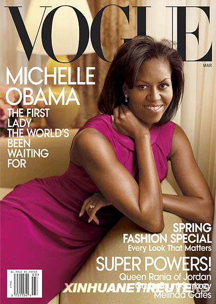 在這張未公布拍攝日期的照片中,美國第一夫人米歇爾·奧巴馬成為著名時尚類雜志《時尚》(Vogue)三月號的封面人物。 據《時尚》雜志2月10日介紹,除了將米歇爾·奧巴馬作為封面人物,本期還會刊登一篇長8頁的第一夫人專訪。新華社/路透