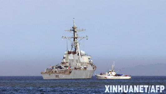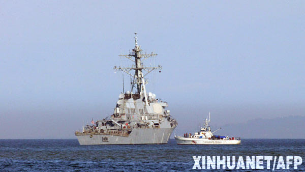 資料圖片:2008年11月22日,“巴里”號美軍驅逐艦停靠在格魯吉亞港口城市巴統附近。美國駐格魯吉亞使館發言人當日說,“巴里”號驅逐艦隸屬美國海軍第六艦隊,原駐扎在意大利那不勒斯,22日抵達巴統訪問。艦上沒裝載人道主義救援物資,也沒裝載軍事援助物資。 新華社/法新
