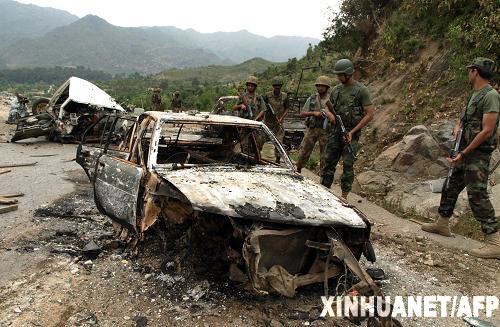 圖為5月3日,巴基斯坦安全部隊在布內爾地區的被毀車輛旁巡邏。巴基斯坦當地電視臺3日報道,巴安全部隊從4月底在西北邊境省布內爾地區開始的針對塔利班武裝的軍事行動,已累計打死80名武裝分子。 新華社/法新