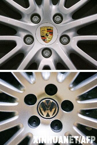 這是帶有保時捷標志(上)和大眾標志(下)的汽車輪轂的拼版照片。 新華社/法新