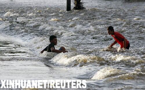 5月7日,在巴西東北部皮奧伊州的埃斯佩蘭蒂納,孩子們?cè)诒缓樗蜎](méi)的街道上玩耍。巴西有關(guān)部門(mén)表示,多日來(lái)暴雨導(dǎo)致的洪水和泥石流已經(jīng)造成至少33人死亡,21.4萬(wàn)人無(wú)家可歸。 新華社/路透