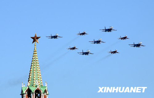 5月9日,在俄羅斯首都莫斯科舉行的閱兵式上,俄羅斯空軍飛機編隊飛過莫斯科紅場上空。當日,俄羅斯舉行盛大閱兵式,慶祝衛國戰爭勝利64周年。新華社記者高帆攝