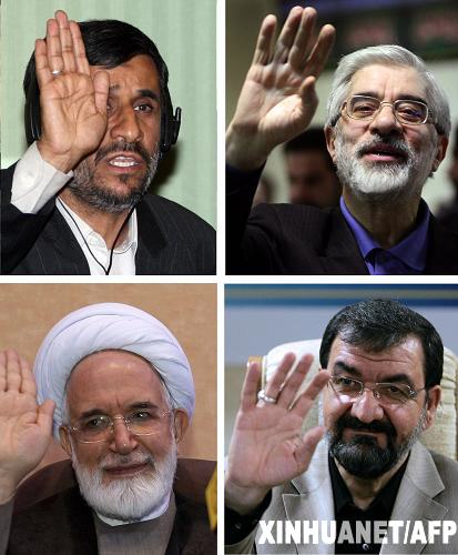 這張拼版照片顯示的是報名參加伊朗新一屆總統競選的伊朗現任總統艾哈邁迪-內賈德(左上)、前總理穆薩維(右上)、前議長卡魯比(左下)和前伊斯蘭革命衛隊總司令、確定國家利益委員會秘書雷扎伊(右下)。伊朗選舉委員會負責人達內什朱5月10日宣布,截至9日,共有475人報名參加6月12日舉行的伊朗第10屆總統競選,比2005年上屆總統競選的1014名報名者減少了約53%。新華社/法新