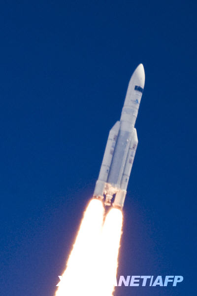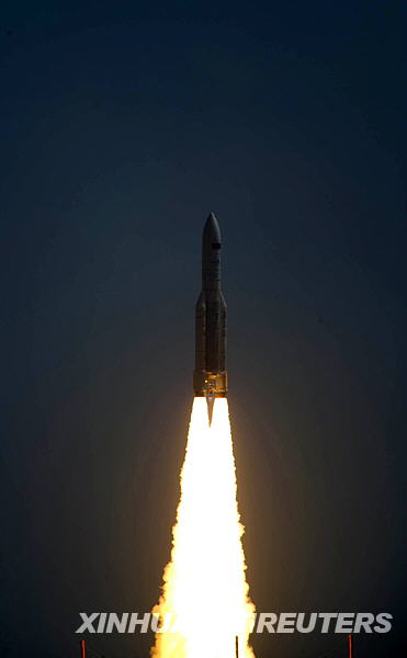 5月14日,在法屬圭亞那庫魯航天中心,歐洲阿麗亞娜5-ECA型火箭發射升空。格林尼治時間14日13時12分(北京時間14日21時12分),歐洲阿麗亞娜5-ECA型火箭攜帶歐洲航天局兩顆科學探測衛星“赫歇爾”和“普朗克”,從法屬圭亞那庫魯航天中心發射升空。新華社/法新