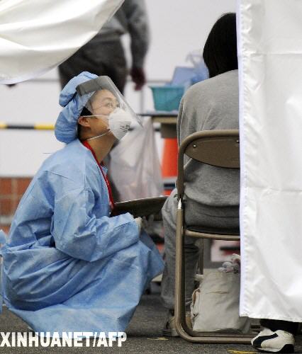 5月17日,在日本兵庫縣神戶的一家醫院,一名醫務人員在發熱門診處詢問病人情況。新華社/法新