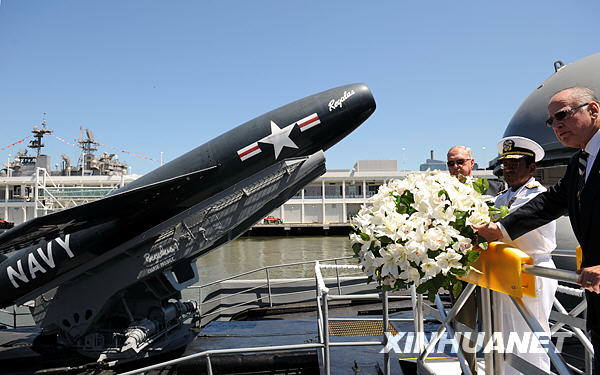 5月21日,在美國紐約曼哈頓86號碼頭,三名曾經在美國海軍核導彈潛艇“黑鱸”號(Growler SSG 577)服役的海軍軍官站在這艘核導彈潛艇旁向水中投擲紀念花籃。