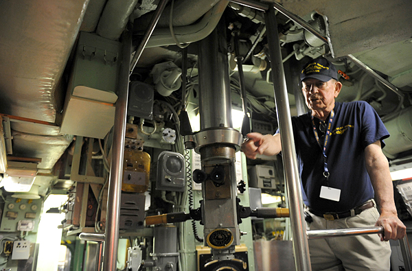 5月21日,在美國紐約曼哈頓86號碼頭,一名曾經在美國海軍核潛艇“黑鱸”號(Growler SSG 577)服役的老兵為參觀者講解這艘核潛艇的構造。新華社記者谷欣容攝