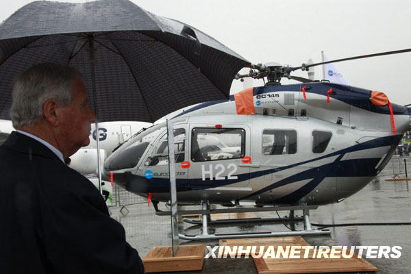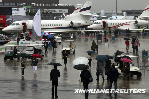 6月15日,在法國(guó)巴黎北郊的布爾歇國(guó)際展覽中心,人們冒雨參觀第48屆巴黎國(guó)際航空航天展。新華社/路透
