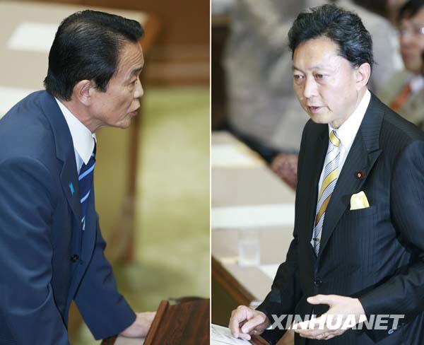 5月27日,在位于日本首都東京的國(guó)會(huì)參議院,日本首相、執(zhí)政的自民黨總裁麻生太郎(左)與最大的在野黨民主黨黨首鳩山由紀(jì)夫(右)在兩黨黨首辯論會(huì)上面對(duì)面交鋒(拼版照片)。當(dāng)日,日本自民、民主兩黨在國(guó)會(huì)舉行今年首次兩黨黨首辯論會(huì)。新華社記者 任正來(lái) 攝
