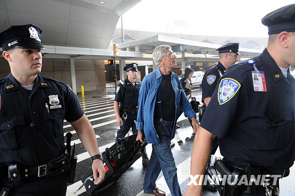 6月18日,美國大陸航空公司第61號航班的乘客在警察的護送下離開新澤西州紐瓦克機場。新華社記者申宏攝