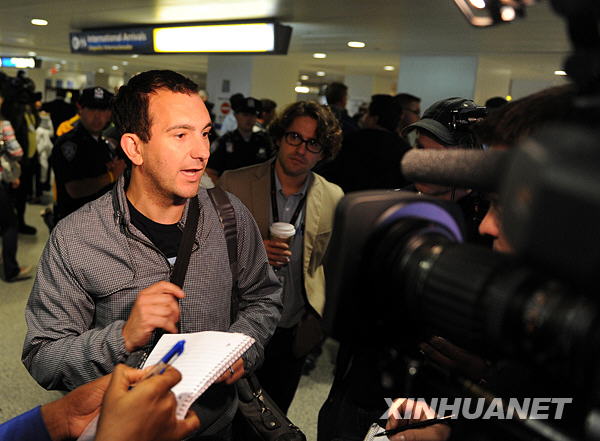 6月18日,美國大陸航空公司第61號航班的乘客海斯在新澤西州紐瓦克機場接受媒體采訪。新華社記者申宏攝