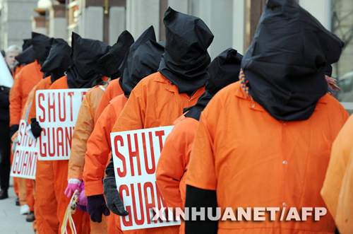 1月14日,在美國首都華盛頓,抗議者裝扮成美國設在古巴的關塔那摩監獄中囚犯的樣子,呼吁美國政府關閉關塔那摩監獄。新華社/法新