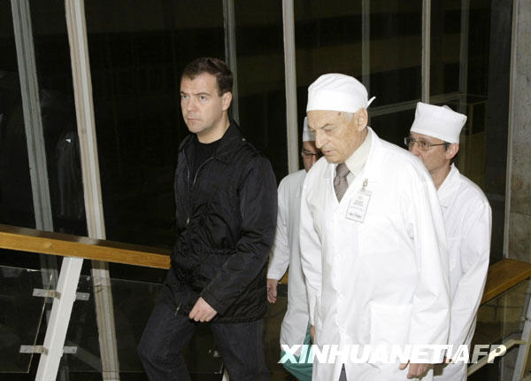 6月23日,在俄羅斯首都莫斯科,俄總統梅德韋杰夫(左一)在醫生陪同下探望身受重傷的俄羅斯印古什共和國總統尤努斯·貝克·葉夫庫羅夫。葉夫庫羅夫的車隊22日上午在印古什共和國首府納茲蘭市附近遭自殺式汽車炸彈襲擊,造成多人死傷,他本人也身受重傷。新華社/法新