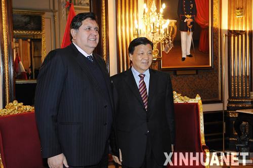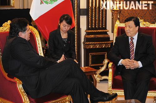 劉云山首先轉(zhuǎn)達(dá)了中共中央總書記、中國國家主席胡錦濤對加西亞總統(tǒng)的親切問候。劉云山說,中秘自1971年建交以來,兩國關(guān)系發(fā)展順利。2008年兩國元首成功實(shí)現(xiàn)互訪,中秘宣布建立戰(zhàn)略伙伴關(guān)系,使雙邊關(guān)系進(jìn)入了新的階段,中秘自由貿(mào)易協(xié)定的簽署對中秘經(jīng)貿(mào)關(guān)系發(fā)展具有重要意義。兩國人文領(lǐng)域的交流與合作勢頭良好。中方高度贊賞秘魯政府在臺灣、涉藏等問題上給予中國政府的堅定支持。中方愿與秘方一道,不斷深化兩國戰(zhàn)略伙伴關(guān)系,努力拓展兩國合作的深度和廣度。