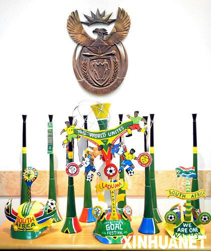 6月29日,世界杯推廣活動上的2010年世界杯宣傳紀念品。當日,南非共和國駐香港特別行政區領事館舉行新聞發布會宣布,南非政府為慶祝2010年主辦世界杯,將在香港舉行為期一年的推廣活動。新華社記者盧炳輝攝