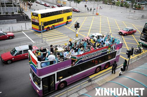 6月29日,宣傳巴士在馬路上巡游。當日,南非共和國駐香港特別行政區領事館舉行巴士巡游,宣傳2010年南非世界杯。新華社記者盧炳輝攝