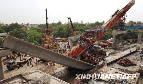 7月12日,在印度首都新德里發生高架橋坍塌事故的現場,救援人員動用吊車清理現場。新華社/法新