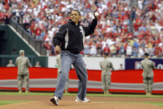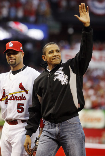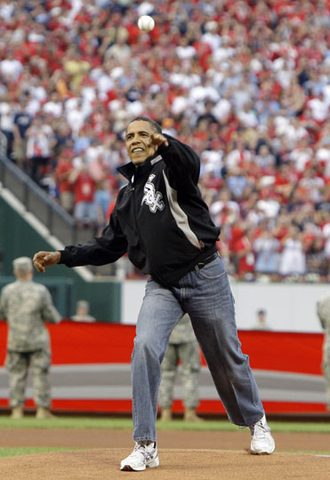 2009年7月14日,2009年美國職業棒球大聯盟(MLB)全明星賽在圣路易斯的布希球場舉行,美國總統奧巴馬為比賽開球。