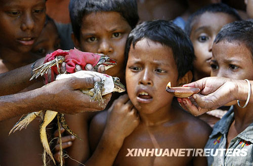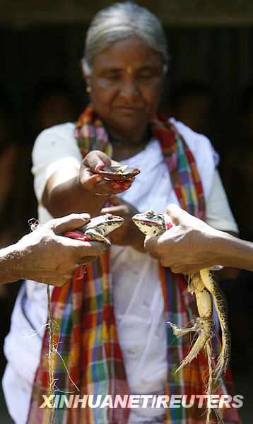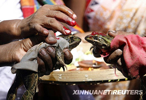 7月19日,在印度城市西里古里以東約85公里的一處村莊,村民舉行儀式為兩只青蛙“完婚”。為青蛙舉行婚禮是當地習俗,以求風調雨順、五谷豐登。新華社/路透