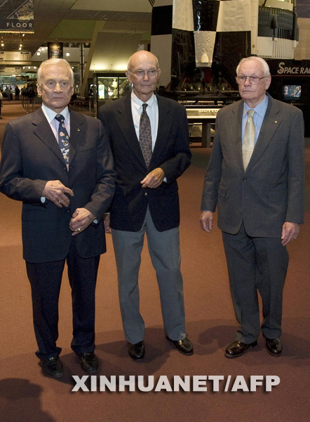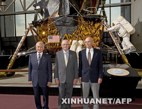 7月19日,首次將人類送上月球的阿波羅11號飛船的3名宇航員巴茲·奧爾德林、尼爾·阿姆斯特朗和邁克爾·柯林斯(從左至右)在華盛頓的美國國家航空航天博物館一起參加一場演講會。7月20日是人類登上月球40周年紀(jì)念日。新華社/法新