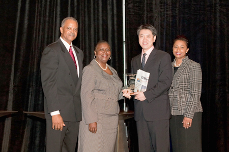 美國(guó)商務(wù)部少數(shù)族裔企業(yè)發(fā)展署東南地區(qū)主任PATRICIA HANES及同事向中國(guó)日?qǐng)?bào)北美總經(jīng)理曹青頒獎(jiǎng)
