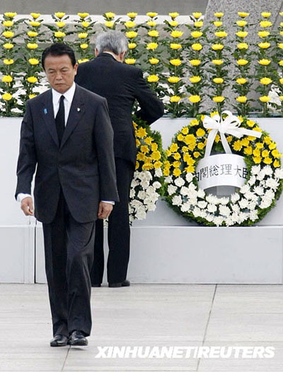 8月6日,在日本廣島,日本首相麻生太郎在向廣島原子彈轟炸的死難者獻(xiàn)花后離開。今年是日本廣島遭受原子彈轟炸64周年,日本各界人士在廣島舉行各種紀(jì)念活動(dòng),悼念原子彈爆炸死難者,祈禱世界和平。為敦促發(fā)動(dòng)侵略戰(zhàn)爭的日本盡快投降,美軍于1945年8月6日和9日分別向日本廣島市和長崎市投下原子彈。日本是迄今世界上唯一一個(gè)遭受過原子彈轟炸的國家。新華社/路透