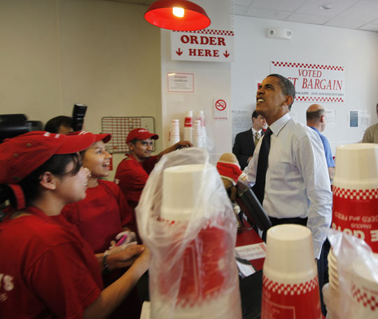 資料圖片:美國總統奧巴馬親自到華盛頓一家連鎖快餐店為白宮員工買漢堡。在排隊期間,奧巴馬吃了點零食,與其他顧客聊天,也有人要求與他拍照留念。